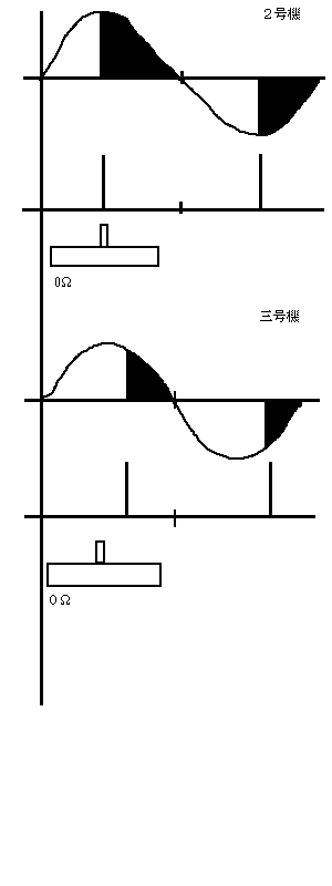 3号機では、スライド位置が半分でも抵抗値は半分より大きいわけですから、パルス位置は右にずれることになります。そのことによりオンが遅れ、光量は減少します。