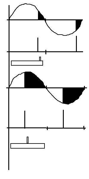 フル灯付近と消灯付近では、スライドの長さに対して増える(減る)電力量(サインカーブの黒く塗りつぶした部分の面積)は少ないですから、並列に抵抗を挟んだ場合、消灯付近のなかなか電力の増えない部分をゆっくり通過し、フル灯付近のスライドしてもあまり電力の加算されない部分を素早く済ますことになります。