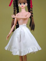 ワンピースのすそにレースが付いているのと思いき や、ペチコートをはいてたりします。 すごく手が込んでます(驚)。 |