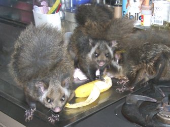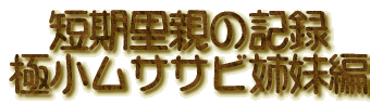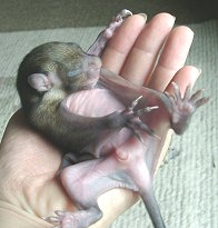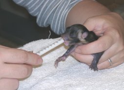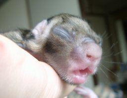 | 2001.5.10 | ごく小さいムササビの姉妹がうちにくる。両方ともメス。むー天、むー地と名づける。そろって73g。ひどく下痢をしているのが気になる。黄色と緑のドロドロ状。ミルクは15tにスプーン3分の1ぐらい。それにビオフェルミン耳掻き山盛り1杯を混ぜる。一日に一度はポポンSを3分の1滴ほど混ぜる。1回に2tほどを2時間おき、一日10回。もちろん目は開いていない。耳も筋は入っているが、まだ穴にはなっていない。頭にピッタリくっついている。 |