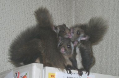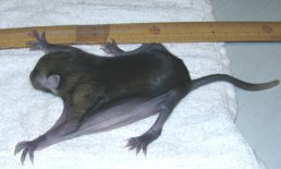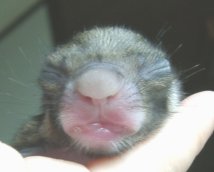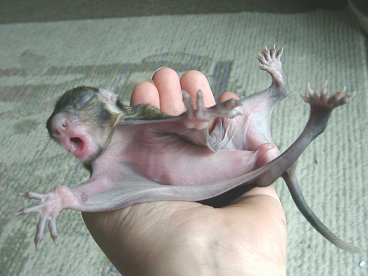 | 2001.6.04 | むー地、やっと目が開く。248g。けっこう遅い。しっぽもまだしょえない。今までに来た子と比べるとかなり遅れているような気がするが、ムササビは個体差が大きいから、どうってことはないのだろう。そのうち追いつくさ。 |