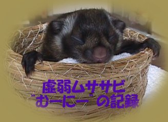 ムササビの里子もついに5代目。ところが、このメスムササビは最初っからずっと下痢が止まらない。おまけに色黒で毛並みが途中で逆になっていたりと、何だかおかしなところがいっぱいの虚弱ムササビであった。名前だけはりっぱな“moony”。意味は「月の」とか「月光のような」という意味である。決して“おむつ”ではない。どう見ても「月」のイメージとは正反対のヤツなのだが、よく調べると、口語では「ぼんやりと、間の抜けた」という意味もあるそうで、これならピッタリである。ともあれコイツの名前は「むーにー」なのだ!漢字で書く時は、かなり強引だが、「むー月」と表記する!