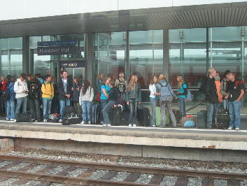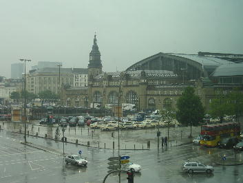 | 途中のハノーバー駅で。生徒がたくさんいたので撮りました。 | ハンブルグ駅に昼頃到着。なんと雨。 |