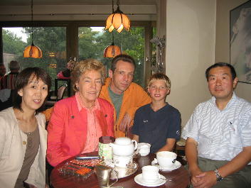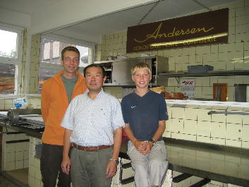 バウムクーヘンのオーブンをバックに記念写真。 |