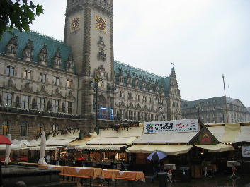 ホテルに戻って一服してからまた市内へ。 ハンブルグのラートハウス(市庁舎)。屋台が出ていました。 |
