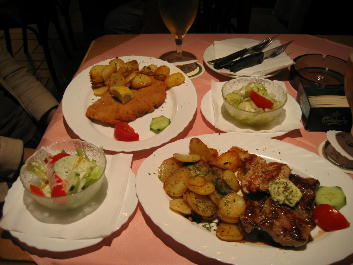 夜は駅前のレストランで、ウィンナーシュニッツェルと ミックスステーキ。 |