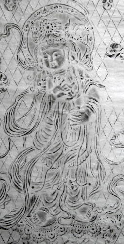 <聖徳大王神鐘(エミレーの鐘)飛天レリーフ拓本:韓国国立慶州博物館蔵・国宝> 最初、拓本1室にあるように左向きの飛天拓本(右図)を持っていましたが (大学の先生に以前もらったものです)、オークションで右向きが出ていたので、 両方ある方がよいと思い購入しました。いずれ、本物の鐘を見に行きたいです。 鐘の説明はこちら |