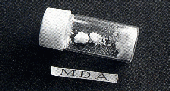 | A. MDMA・MDAは、合成麻薬(けしやコカなどの植物からではなく、他の化学薬品から合成された麻薬) の一種で、「麻薬及び向精神薬取締法」 の規制の対象となっています。 MDMAは、別名エクスタシーとも呼ばれ、白色結晶性粉末ですが、錠剤又はカプセルの形で密売されています。 MDAは、別名ラブドラッグとも呼ばれ、白色粉末ですが、その純度によって黄色や茶色のものがあり、まれに琥珀色の液体のものもあります。 |