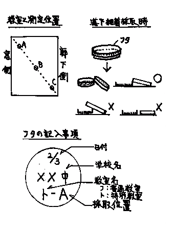 空中細菌測定法はKochの落下細菌法という方法で空気中浮遊細菌のうち、一定時間内に培地上に落ちてきた数を測定する方法です。この培地は、プラスチックシャーレ(殺菌済み)に普通寒天培地が約10ml注がれ平板状態で凝固しているものです。