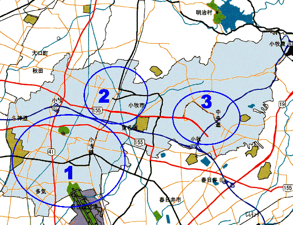 地図上の円で囲まれた部分をクリックして下さい。基準薬局の詳細図が見られます。