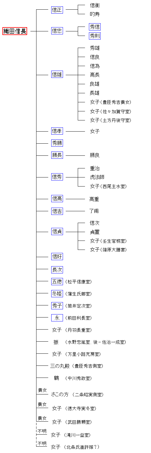 信正 信忠 信雄 信孝 秀勝 勝長 信秀 信高 信吉 信貞 信好 長次 五徳 冬姫 秀子 永 秀信 秀則 信長の末裔2 兄弟編へ