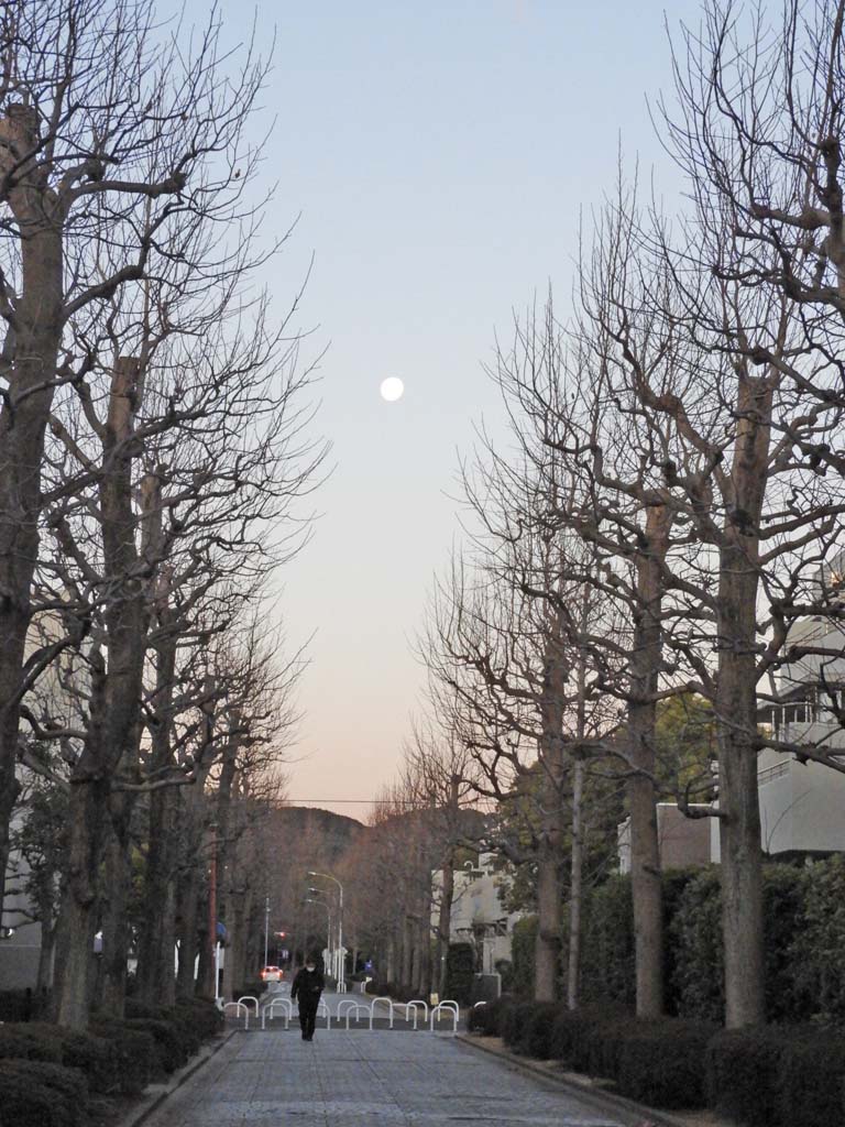 2月4日も朝は冷え込んで寒かった。その朝、カゼ場公園でのラジオ体操を終えた後、家に戻るとき東西に走るユリノキ並木の正面西に月がかかっていました。何時でも見られるようで、たやすく見られる場面ではありません。陰暦の月の名は、それが見え始めた日の名称です。陰暦15日ころの満月を望月と言い、翌16日の月を十六夜月と言います。写真の月は陰暦の16日に出たものですから、満月に近い十六夜月であると言えるでしょう。この日の後、日毎に東(左)に月は移動し、06:30からの体操時には南の空に見えました。雲1つ無い空に輝く月は美しかった。