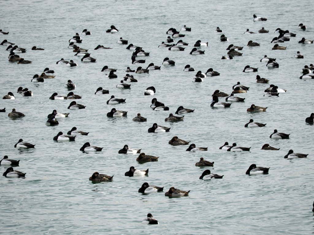 13日の朝鳥浜の横浜南部市場にある電気屋にプリンターのインクを買いに行きました。行く途中遠回りしてベイサイドマリーナ経由、その北東端にある自称海産資源保護湾に立ち寄りました。久しぶりの訪問ですが、何となく鳥がいるような予感がしていました。来てみると今冬初の鳥の大群がいました。その群れに近い岸に行き、撮ったのが下の写真です。群はスズガモでした。その周りにカンムリカイツブリもいましたが、少数でした。