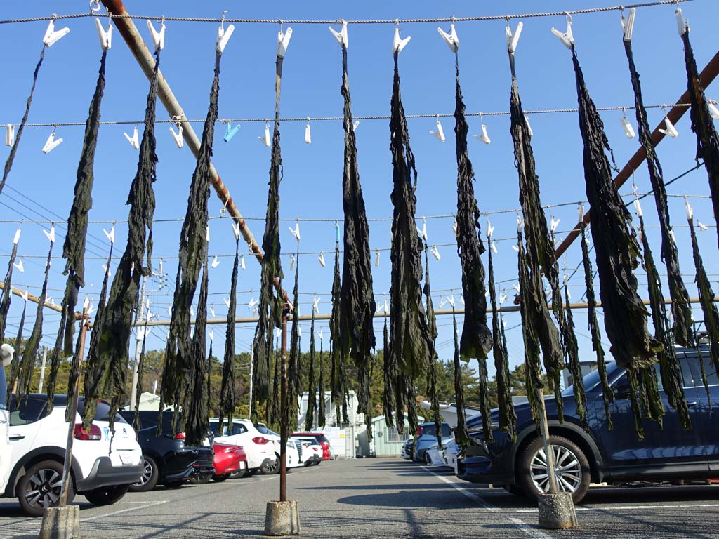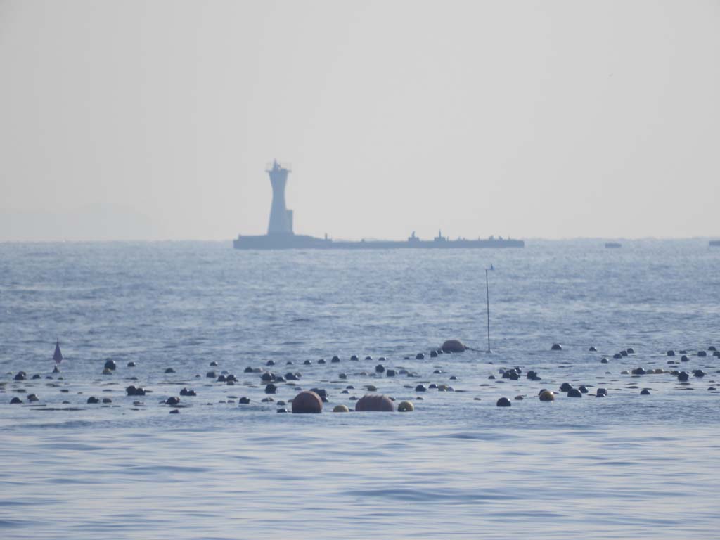 その日(2/14)の朝、柴シーサイドファームの朝市に行った帰り、野島の海にスズガモが来ているかどうかを確かめに行きました。途中、海の公園の南端にある金沢漁港に寄りました。その港の防波堤から見ると、野島の海に水鳥の姿はありませんでした。そこで野島まで行くのを止めました。その時に見たのが下の風景です。この朝はもやり、沖行く船や、沖の灯台が霞んで見えていました。