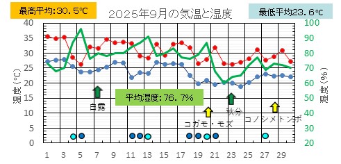 晴れ:14日 曇り:6日 小雨:4日 雨:9日 夏日:17日 真夏日:5日 |