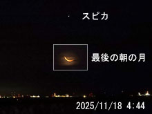 右は18日の未明、東南東の水平線上に昇の月の出の風景です。おりしも月の上空に乙女座のアルファ星であるスピカが見えていました。