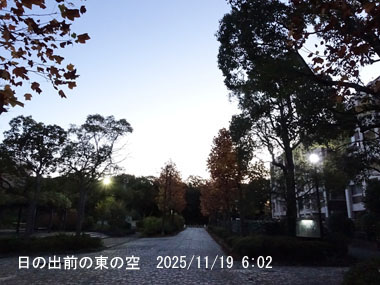 下は翌19日の明るい夜明けの風景です。我が家の玄関先の歩道から撮りました。月はいろいろの歌に歌われました。そして歌は世につれて移り変わります。私が思い出す月に絡んだ歌と言えば戦後に流行った「かえり船」でした。歌は終戦後、異国から引き上げる人々の心境を切々と歌っています。