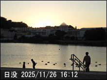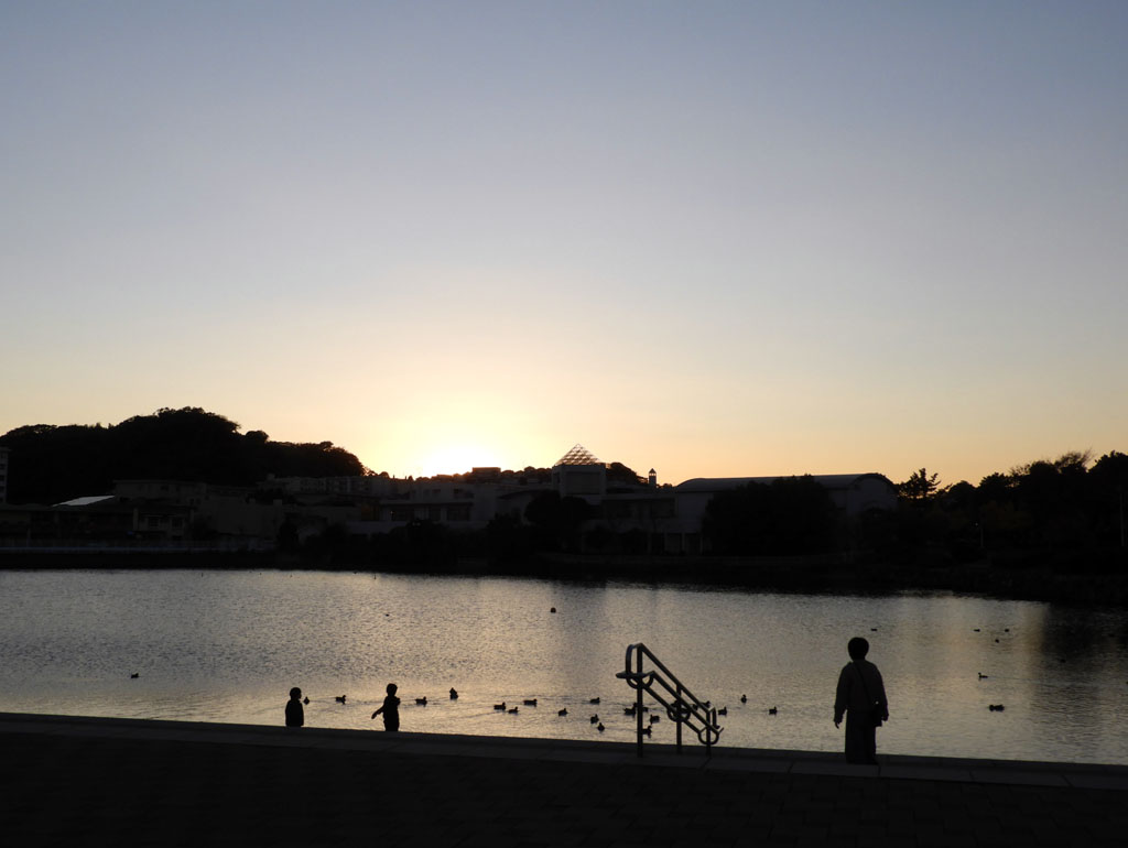船溜まり公園のベンチで日暮れまでおしゃべりを楽しんでいた老婆たちも、最近の寒さでその姿を見ることがなくなりました。しかし、子供たちは元気です。今日も遊び足らずに日没を惜しんでいました。横浜で最も早い日没の日と時刻は12月5日頃で16:28時です。写真の時刻は撮影時刻で、その日の日没は16:30時でした。前方の富岡の丘があるため、この場所での日没は18,9分ほど早かったことになります。