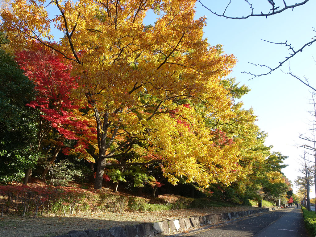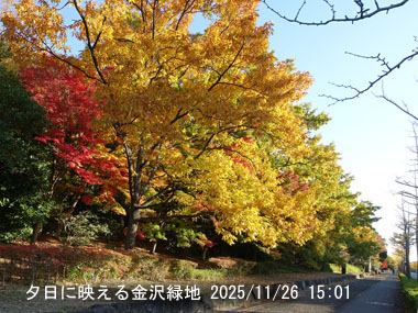 金沢緑地の紅葉が進んでいます。緑地は南北に4Kmほど走っています。その緑地が美しく見える時刻は午後の夕日を受けた時です。赤味を帯びた夕陽が紅葉を一層色鮮やかに浮きたたせます。そして歌うのは童謡の「紅葉(もみ)」じです。