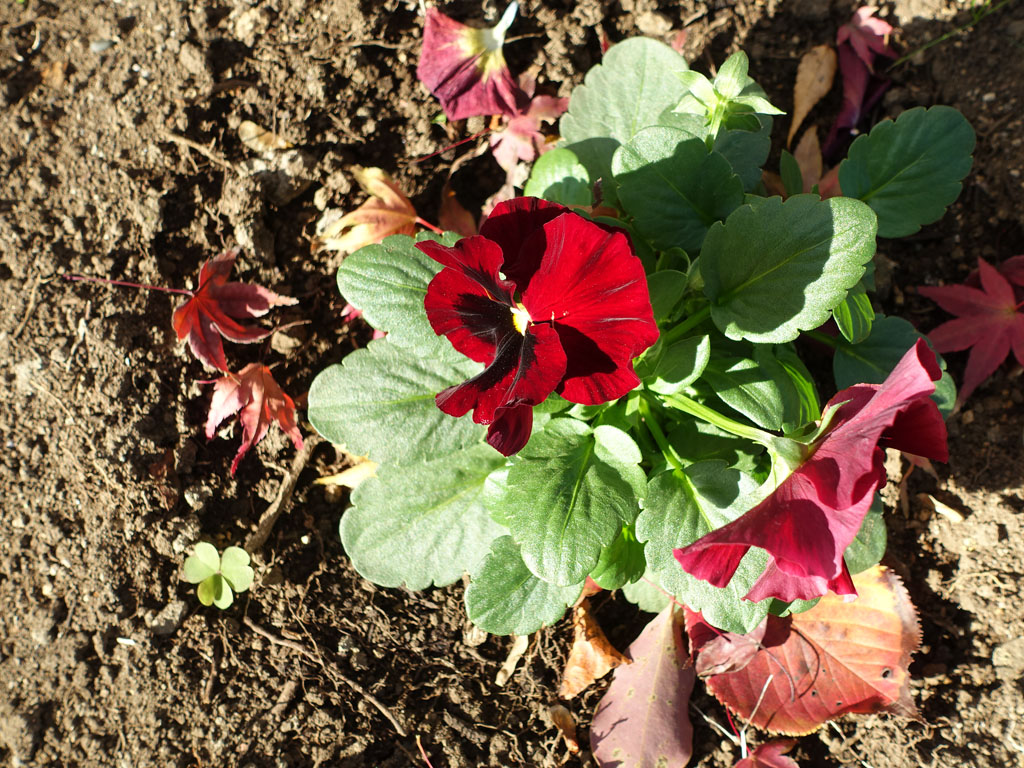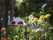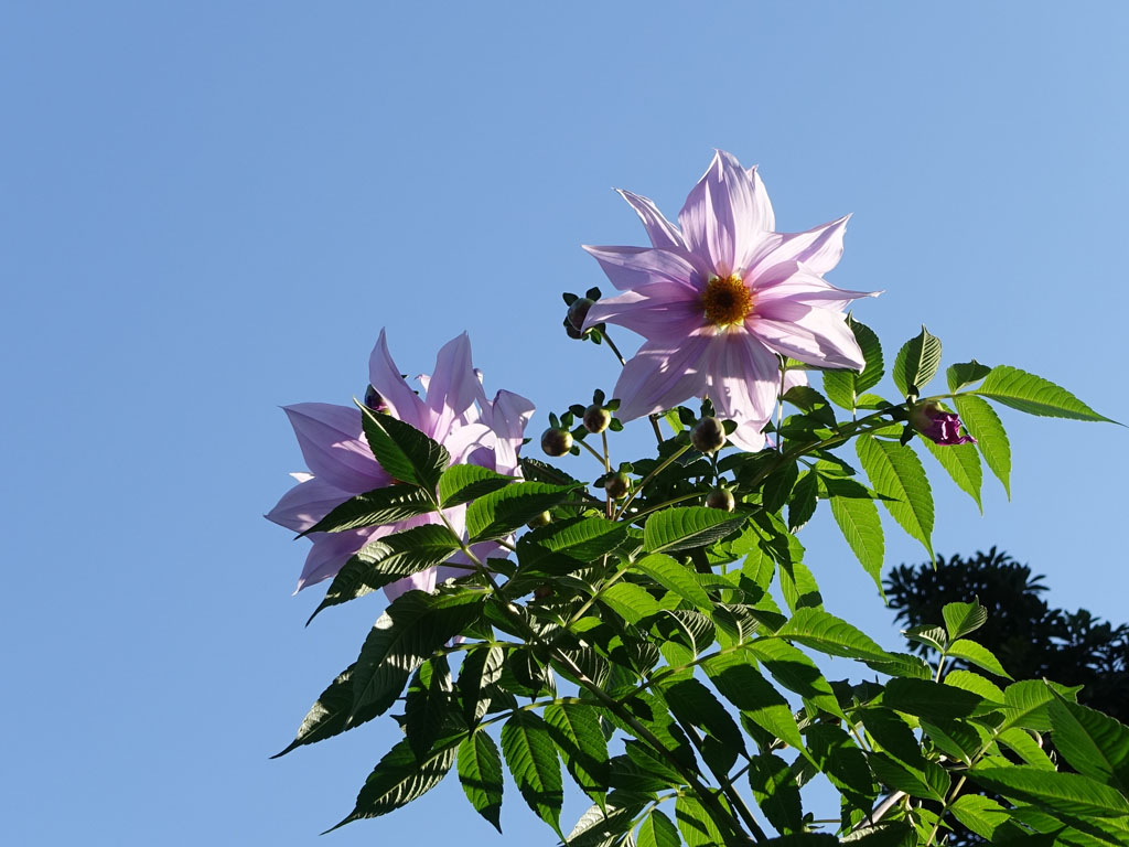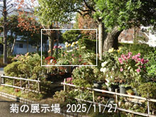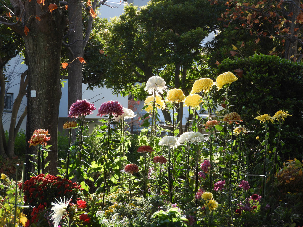 右の写真は朝の陽を受けて輝く花の展示場です。場所は並木1丁目14街区の歩道と車道が交差する角地です。世話をしているのは個人で、雨風の日の前後に菊の大鉢を出し入れする労力と気遣いは凡人の域を越えています。おりしも大小の菊が花盛りで、12月上旬まで楽しめるでしょう。