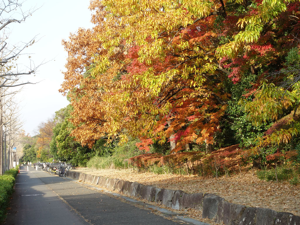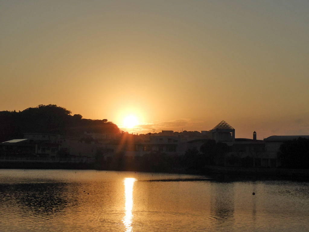 このページの写真は12月2日の午後の風景です。その日は昼頃から晴れました。上は午後の日を受けて輝く金沢緑地の紅葉です。下は同じ時間帯に見た波雲です。右下はその日の日没の風景です。太陽は南西の稜線上に沈みました。