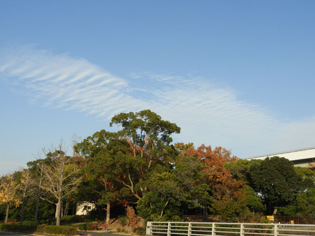 波雲を見た時、上空の風は波に対してどちらから吹いているのだろうと思いました。波に並行か、それとも垂直か、WEBで調べると、どうやら波に対し垂直のようです。電子辞書のWikipediaにその発生のメカニズムが載っていました。解説の要点を紹介します。波雲を波状雲(はじょううん)と言い、学術名はundulatusという。温暖前線の進行方向のはるか先に現れる。この日は低気圧が日本海にあり、進行方向に温暖前線を、後方に寒冷前線を伴っていました。温暖前線の後方では暖気が寒気の上を吹いて、その境界面で暖気は上下に波打って流れたものと思えます。波が上昇するところでは空気が冷やされて雲となり、下降するところでは温められて雲が消えて波の形になるという。翌3日は西高東低の気圧配置となり、4日は晴れて寒気が流れ込んで冷え込みました。風がなければ霜が降りますが、この日は明け方まで北風が吹いたと見えて霜は見られませんでした。代わりに大量の枯れ葉が落ちていました。