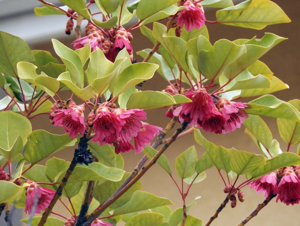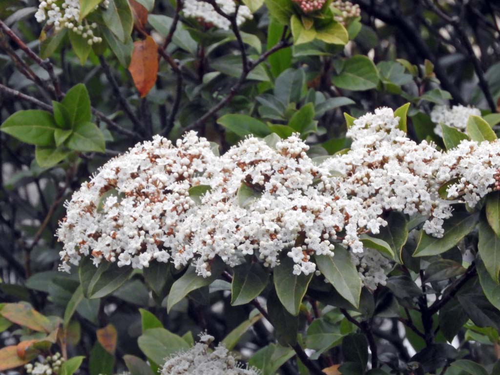| 珍しい木2種 2026/03/20 能見台5 左の赤花は東南アジア原産のシャクナゲモドキ。マンサク科の常緑小高木 右の白い花は地中海沿岸原産のトキワガマズミ。ガマズミ科の常緑灌木 |