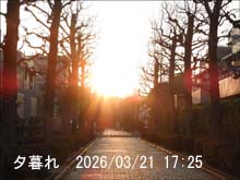 上は21日の夜明けと日暮れの風景です。その日の日没は17:54でした。その30分前、太陽は東西に走る並木の真正面で輝いていました。