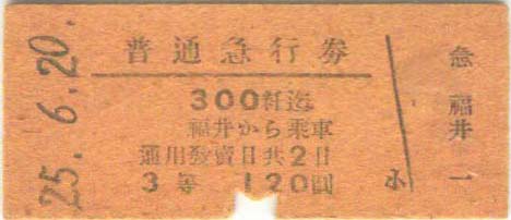 昭和25年6月20日。 福井から大阪までの乗車券300円。 急行券120円。 |