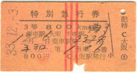 特急平和。 昭和33年12月3日。 大阪発博多までの特急券。800円 | |