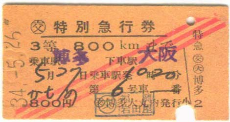 特急かもめ。 昭和34年5月26日。 博多発大阪までの特急券。800円 | |