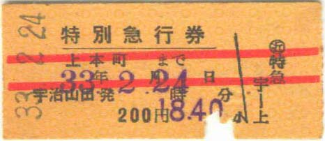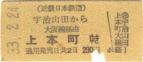 昭和33年2月24日 近鉄宇治山田から上本町への乗車券290円 特急券200円 |