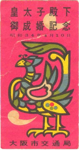 昭和34年4月10日 大阪市交通局発行の皇太子殿下御成婚記念券。 | |