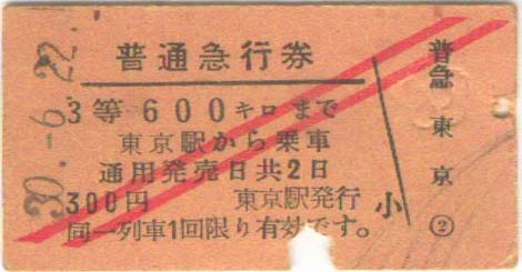 昭和30年6月22日。 東京駅から600kmまでの急行券。300円 | |