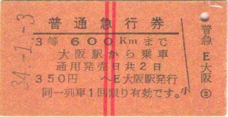 昭和34年1月3日。 大阪駅から600kmまでの急行券。350円 | |