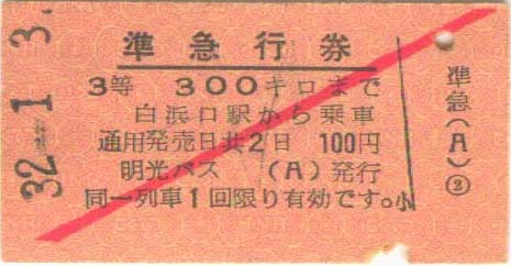 昭和32年1月3日。 白浜口駅から300kmまでの準急行券。100円 | |