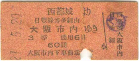 西都城から大阪行き。 昭和21年5月20日。60円 | |