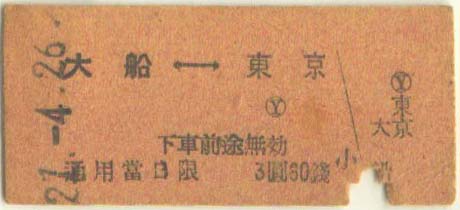 大船/東京間往復券。 昭和21年4月26日。3円60銭 | |