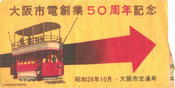 昭和28年10月 大阪市交通局発行の 大阪市電創業50周年記念券。 | |
