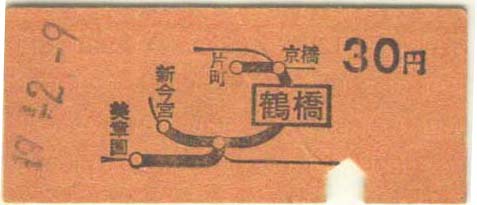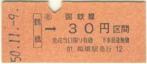 昭和49年 昭和51年 鶴橋駅発売の普通乗車券 30円 |