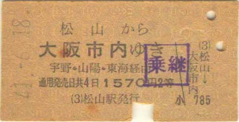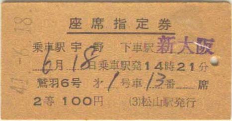 昭和41年6月18日。 松山から大阪までの乗車券1570円。 鷲羽6号の座席指定券100円。 |