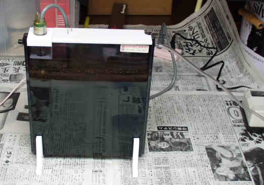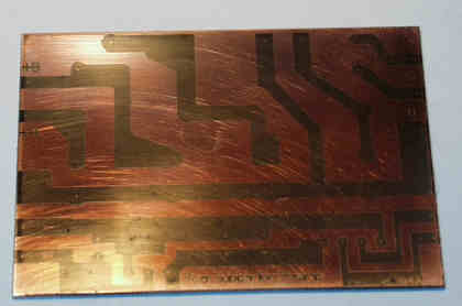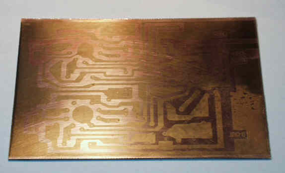 次はエッチングです。私はサンハヤトの噴流式エッチング槽を使っています。エッチング温度は約45℃で行ないます。基板を槽にいれて約15分くらいでエッチングか完了します。エッチング途中、パターンのきれを確認しながら、ジャストエッチ+1分くらいのオーバエッチを加えます。エッチング後、十分水洗いをします。そして水切り、乾燥をします。
