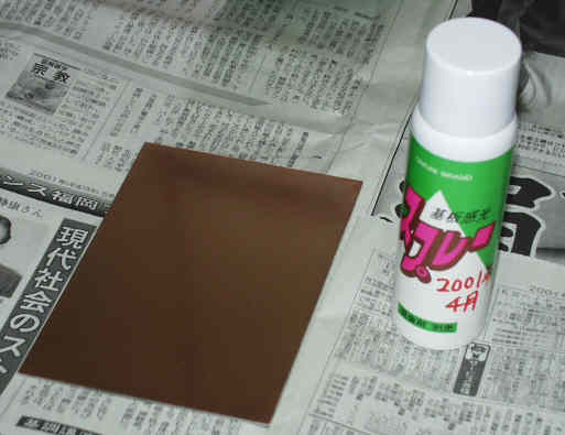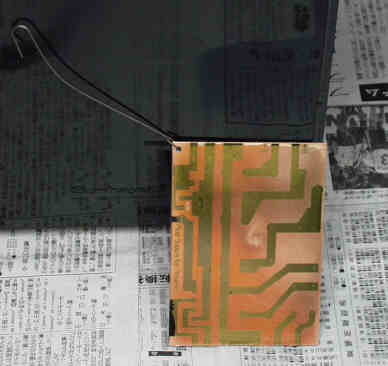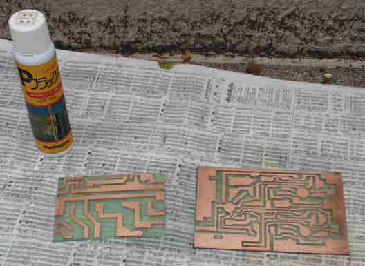 次にレジストを塗布します。部屋の明かりを消して豆電球だけにして行ないます。塗布は、基板を古新聞などの上に水平において、30cmくらいの距離からまんべんなくスプレーします。言葉で表現が難しいのですが、一面に塗布できるようにすばやくスキャンしながら行ないます。塗布した直後は、銅箔面にまだらな模様が出来ますが、しばらくすると自然に均一になります。そのまま15分くらい自然乾燥します。この時ごみがレジスト塗布面に付着しないように注意が必要です。引出しの中で乾燥させたりするのも有効です。