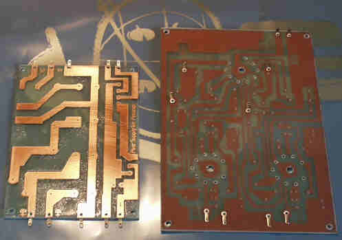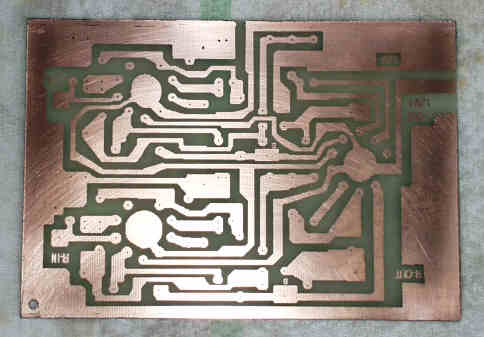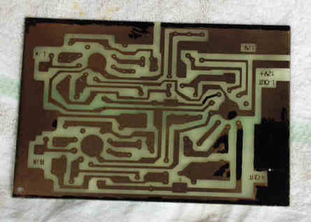 プリント基板は、マルカ(ラジオデパート1F)でガラスエポキシの生基板を購入しました。それにスプレータイプのレジストを併せて購入しました。レジスト塗布から行なうのが面倒な場合はサンハヤトのレジスト付の感光基板でもOKでしょう。私はいつも自分でレジスト塗布から行なっています。現像材はサンハヤトの物が利用できます。