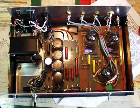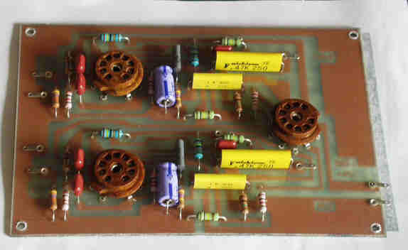 このアンプは、前述の6CA7シングルアンプと一緒に使うプリアンプとして製作しました。このアンプも子供たちがお世話になっています美術教室の先生とそのご主人からの依頼で、「先日のパワーアンプで、LPレコードを聞きたい」という要望にお応えするために製作したプリアンプ(イコライザー部のみ)です。また、LPをMDに録音して、且つ再生が出来るようにとの希望もありました。使用されているカートリッジがMMタイプなので、一般的なイコライザーアンプ(EQアンプ)です。