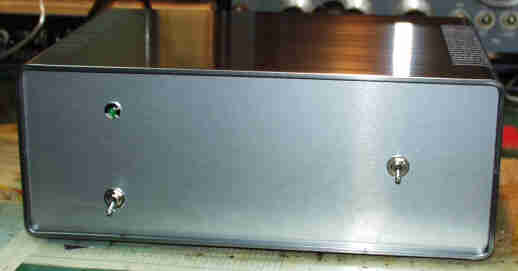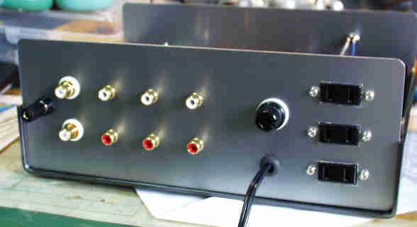 次に、ケース加工に入ります。端子やスイッチ類の穴あけが中心です。トランスとイコライザ基板の配置は、トランスの漏れ磁束の影響を極力避けるべくもっとも離れた配置とします。穴があいたら、部品の取り付けです。前後のパネル、ケースボディ部へそれぞれの部品を取り付けます。プリント基板は、スペーサーで浮かす際に、ゴムブッシングをはさんでインシュレータ代わりにします。振動からくるハウリング対策です。
