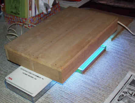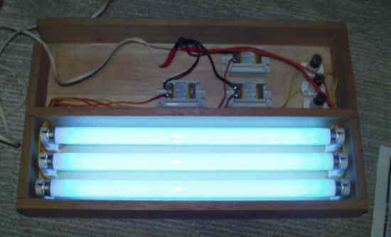次は感光です。感光に使用する光源は、ケミカルランプを3本並べた作った自作の露光器を使っています。