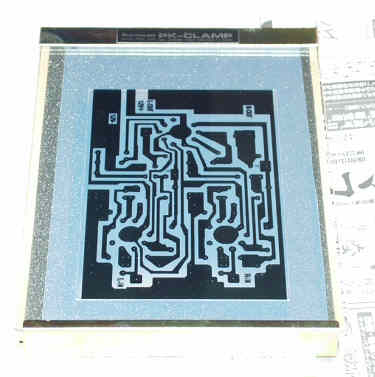 レジストを塗布した基板に、マスク(OHPフィルムシートにパターンを印刷したもの)を重ねて、ガラス板で押さえます。私はサンハヤトのPKクランプを使用しています。