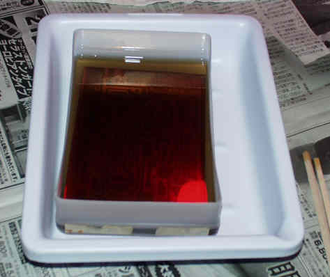感光が終わったら、現像です。現像液は、サンハヤトの現像材を200ccの水に溶かしたものを用意しておきます。この現像液は何回か使用できるのでポリ容器にいれて残しています。現像の温度は約30℃です。これくらいの温度がうまくいきます。ポリのバットを2重にして湯せんで30℃を作ります。先ほどの感光した基板を銅箔面を上にして現像液に浸します。そして常に揺さぶりながら約2分現像します。徐々にパターンが浮かんできます。ある程度パターンがくっきりとなったら、水洗いをして定着します。約5分くらい流水洗浄します。この段階から光にあててもOKです。ウェスで水滴を軽くふき取って、ドライヤーを弱にして5分間程度温風乾燥します。