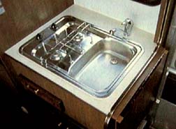 縦型コンロとシンク一体型のキッチン。 少々小さいのが難点ですが、キッチン 右側のサイドテーブルをセットすれば、十分な 料理スペースが得られます。 |